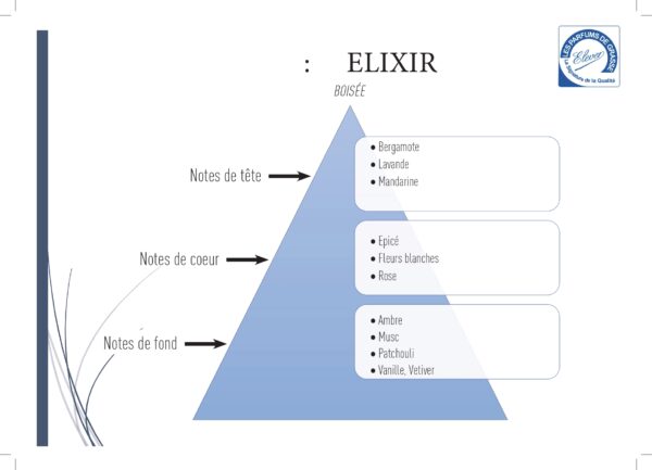 Elixir, votre parfum très personnel dans un sillage noble et raffiné. C’est un souffle de fraicheur qui laisse sur son sillage liberté, soleil et fruit de jardins méditerrannéens, agrémenté de poivres colorés.